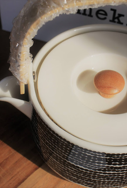 Mietimme miehen kanssa, että mistä kaikesta hän oikein pitäisi. Kun muistimme hänen olevan teeihmisiä, lahjavalinta olikin yllättävän helppo! Mutta olinpa minä hölmö! Ensin nimittäin harkitsin saksalaisia merkkejä ja etsin eri nettisivuilta kauniita teeastioita. Onneksi meillä kummallakin välähti ja googletimme heti Marimekon tuotteet. Tämä musta-valkoinen 'Räsymatto' -kuvioinen oli kyllä tosi kiva ja ei kun tilaukseen.